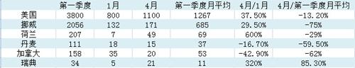 特斯拉1月和4月全球市场交付预估量对比(单位:辆)