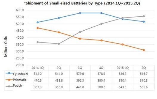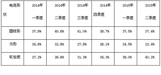 圆柱形电池在电动汽车上的使用量在增加,而用于笔记本电脑的数量在减少,主要被软包装电池所替代。2014年使用圆柱形电池的移动电源制造商也开始使用软包装电池,因此,圆柱电池的总出货量在下降。方形电池过去主要用于手机,而软包装电池越来越广地用于智能手机,造成方形电池的需求在持续下降。