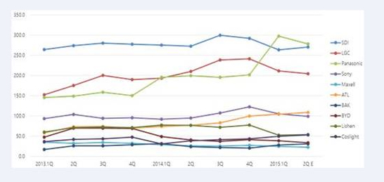 由于软包装电池被用于苹果Iphone6和三星Galaxy S6成为大势所趋,而且软包装电池也被用于超薄笔记本电脑,这种趋势预计将会继续。全球主要企业各季度出货量变化情况见图三。