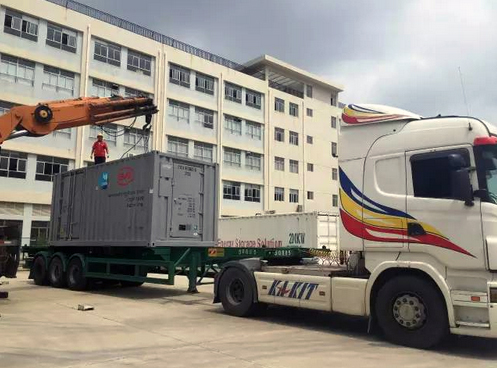 2015年9月11日,比亚迪电力科学研究院132kW/150kWh集装箱储能产品在生产基地打包、吊车、装车,并顺利运往港口出货澳洲。