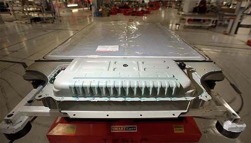 特斯拉生产线上等待安装的电池。松下将与特斯拉合作新建一个大型电池制造厂。