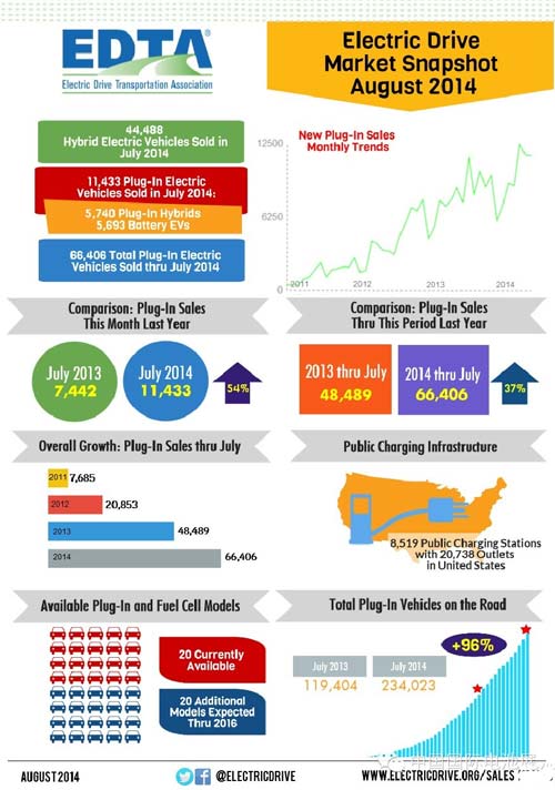 据美国华盛顿的电动交通协会近日公布的在美电动车市场销售数据显示,七月份上路行驶的插电式电动车总量同比去年增长了96%。插电式电动汽车从2010年末到2013年7月共计销售119,404辆。从那时起到2014年7月,共售出114,619辆插电式电动车,使销售总量达到了234,023。