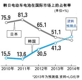 韩国汽车电池市占率正在赶超日本,成为全球第一。市场调查企业B3称,去年世界电动车电池销售量的51.1%都是日本企业的,韩国占41.3%。早期的电池市场日本占了70%以上,业内人士预期,今年韩国开始赶超日本,估计在小型电池和中大型电池上都会成为第一名。