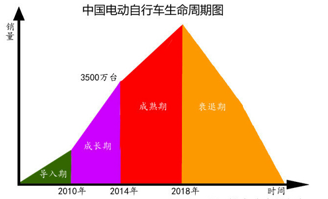 再次,拐点期后,电动自行车品牌格局初定。观察行业生命周期图,2018年前后中国电动自行车行业将进入真正意义上的成熟期,品牌将大幅度减少,如上文所述,成熟期的品牌数量将大幅度减少,一线品牌阵营扩大,一大批中小企业将不复存在。按照“二八法则”的理论。一线品牌的总销量均将能突破200万台。