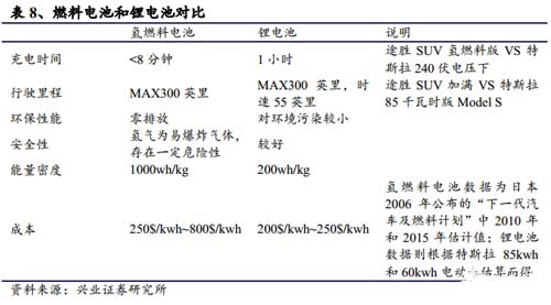 锂电池和燃料电池相比较,锂电池的优势在于更安全、成本更低;而燃料电池的优势则在于充电时间更短、能量密度更高。从目前的技术看,氢燃料电池需要新建一个产业链来支撑,这需要很长的时间和大量的投资。而锂电池从发明以来,随着技术的进步和产业化的扩充,每年都有小幅度的降价和容量提升。日本在2005年就开发出来了性能比特斯拉Model S更优异的Eliica,但是当时锂电池的高昂价格注定这个产品只是试验品。而目前特斯拉电动车火爆全球,宝马混合动力的i3、i8都要上市,保时捷918也已经预订。这都说明2013年锂电池的价格已经降低到一个可以接受的范围。未来几年,随着锂电池价格的进一步下降和容量的进一步提升,电动车的普及度有望进一步提升。总而言之,短期来看锂电池主导的电动车会是主要方向,氢燃料电池则需要长期的发展,但有望后来居上。