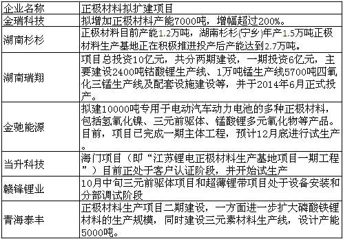 新能源汽车市场的蓄势待发,正诱惑锂电正极材料领域掀起新一轮的扩产热潮。截止到2013年,中国正极材料生产企业已达200多家。2014年下半年正极材料即将扩产或投产的公司统计如下: