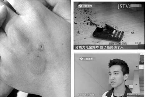 今年6月份,一位祁姓的南京小伙在火锅店吃饭时,使用充电宝为手机充电仅不到10分钟的时间,这款充电宝产品就突然爆炸,并且充电宝的外壳碎片以及电池碎屑也炸的到处都是,而在聚餐的小伙伴当中,一位朋友的手背被炸伤,小祁也感到有碎片溅到自己的腿上。就在爆炸发生后几秒,充电宝又发生了二次爆炸。事后小祁回想起这次事故仍心有余悸,并发微博提醒网友谨慎使用此类产品。