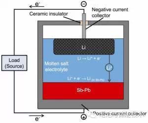 最近刊登在英国《自然》杂志上的一篇文章描述了该电池的结构。它由锂—锑—铅电池由液态锂金属负极、熔盐电解液和液态锑铅合金阳极共同组成。这三种金属因密度不同而自身形成三个分界明显的熔盐层,相邻熔盐和金属相之间互不相融。该电池并没有采用任何滤膜或隔板。