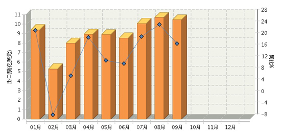 根据海关总署公布的数据,2014年1~9月,全国电池行业累计完成出口额80.21亿美元,同比增长15.22%。其中,9月份完成出口额10.45亿美元,同比增长17.95%。2014年全国电池行业月度出口额及同比数据如上图所示。