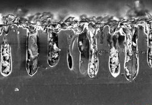这个神奇的结构就是纳米孔,麻雀虽小,五脏俱全。在陶瓷片层上一个纳米级别的小孔内盛放电解质,电解质能在孔两端的纳米管电极之间传输电荷。目前的装置还只是一个测试,但测试中这枚小个头的电池表现良好。论文第一作者刘婵媛(音译)是马里兰大学材料科学与工程系研究生,她表示,小电池在12分钟内就能充满电,而且能够反复充电上万次。