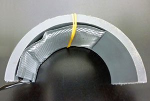 这款电池可由接近平面的状态自由弯曲。铝制的外装上有微细的凹凸,具有伸缩性。力争在今后应用于有望普及的可穿戴终端。