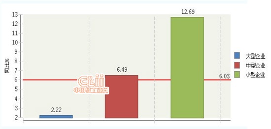 从企业规模看,小型企业增长速度加快。大型企业完成累计主营业务收入占41.14%,同比增长2.22%;中型企业完成累计主营业务收入占35.54%,同比增长6.49%;小型企业完成累计主营业务收入占23.32%,同比增长12.69%。(参见图5、图6)