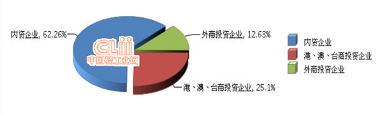 从企业注册类型看,内资企业主营业务收入占比大增速快。内资企业完成累计主营业务收入占62.26%,同比增长10.91%;港、澳、台商投资企业完成累计主营业务收入占25.1%,同比增长-2.67%;外商投资企业完成累计主营业务收入占12.63%,同比增长1.99%。(参见图3、图4)