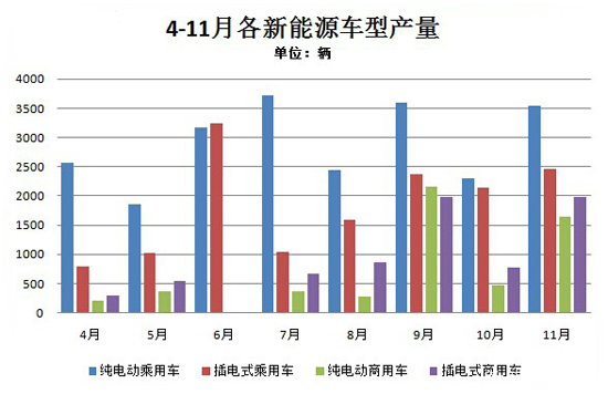 2014年1-11月,新能源汽车累计生产5.67万辆,同比增长5倍。其中,纯电动乘用车生产2.58万辆,同比增长近7倍,插电式混合动力乘用车生产1.36万辆,同比增长近25倍,燃料电池乘用车生产6辆;纯电动商用车生产7363辆,同比增长188%,插电式混合动力商用车生产9949辆,同比增长245%。