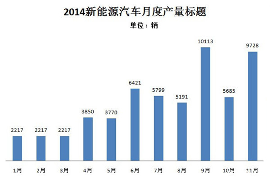 12月3日工信部装备工业司发布数据显示,根据机动车整车出厂合格证统计,2014年11月,我国新能源汽车生产9728辆,同比增长10倍。其中,纯电动乘用车生产3540辆,插电式混合动力乘用车生产2469辆;纯电动商用车生产1640辆,同比增长14倍,插电式混合动力商用车生产1977辆,同比增长41倍。列入《免征车辆购置税的新能源汽车车型目录》前两批的新能源汽车生产7932辆,占11月产量的81.5%。