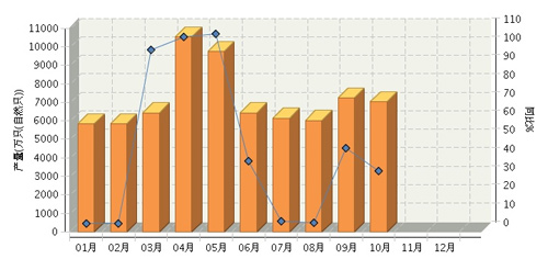 2014年1~10月,全国锂离子电池行业累计完成产量43.56亿只(自然只),同比增长4.56%。其中:10月份完成产量5.05亿只(自然只),同比增长-7.48%。