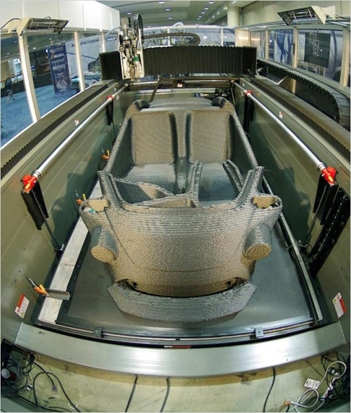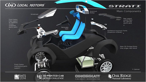 辛辛那提公司负责提供制造Strati使用的大幅面增材制造3D打印机,其能够打印3英尺×5英尺×10英尺(约合90厘米×152厘米×305厘米)的零部件。公司CEO安德鲁-贾米森表示:“大幅面增材制造3D打印机可用于实际生产,碳纤维增强ABS塑料的熔融沉积速度可达到每小时40磅(约合18公斤)。”