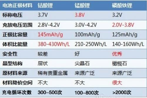 下表为磷酸铁锂电池和锰酸锂、钴酸锂电池的几个比较明显的数据对比,主要通过标称电压、充放电压范围、体积比能量等几大方面进行对比。
