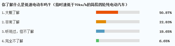 调查数据显示,在参与网络投票的人群中,有50.87%的网友表示对于低速电动车“大概了解”,另有22.83%的网友选择“非常了解”,占比超过70%,说明低速电动车这类产品在市场上的确拥有很高的关注度,选择“完全不了解”这一选项的网友仅占全部调查人群的6.65%。