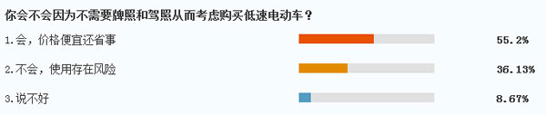 而由于现在低速电动车尚处于政府无政策法规监管的“灰色地带”,所以有55.2%的网友也表示“会因为不需要牌照和驾照从而考虑购买低速电动车”,比选择不会的要高出近20个百分点。