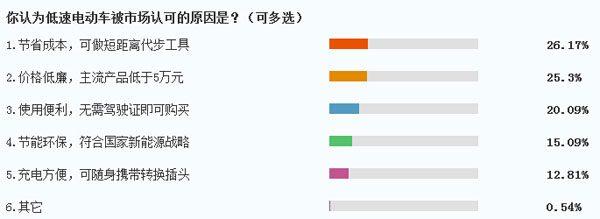 调查数据显示,有26.17%的网友认为低速电动车普遍受到市场欢迎主要是因为在使用过程中可以“节省成本,并作为短距离代步工具”,这同时也是消费者对于低速电动车最基本的诉求。其次,有25.3%的网友选择了“价格低廉,主流产品低于5万元”这一选项,这基本上也符合低速电动车这一细分市场的定位。