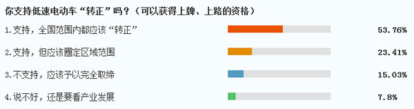 对于这一争议话题,参与调查的77.17%的网友都对于低速电动车“转正”表示了支持,其中53.76%的网友更是认为应该在全国范围内将低速电动车“扶正”,充分满足市场的需求。