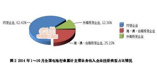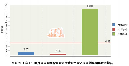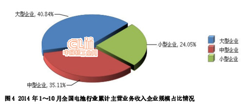 2014年1-10月,全国电池行业累计完成主营业务收入同比增长4.82%。其中:10月份完成主营业务收入同比增长-3.41%。(参见图1)