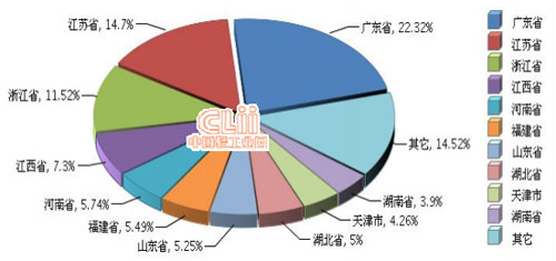 2014年1~11月全国电池行业主营业务收入较高的产区主要集中在广东、江苏、浙江、江西、河南、福建、山东、湖北、天津、湖南地区,十个地区完成主营业务收入占全国的85.48%。