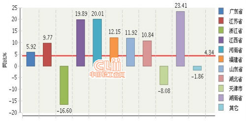 2014年1~11月全国电池行业累计主营业务收入主要地区同比增长情况