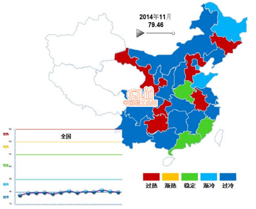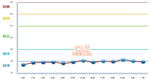 2012年7月至2014年4月中轻电池景气指数在“过冷”区连续运行,5至11月在“渐冷”区与“过冷”区徘徊,11月为79.46比10月80.09有所下降,再入“过冷”提示区。