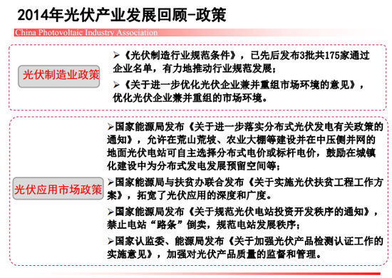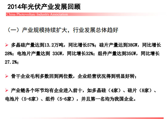 近期,中国光伏行业协会秘书长王勃华在“光伏行业发展与投资分析——2014年回顾与2015年展望”研讨会上总结了去年我国光伏制造端以及应用市场的整体情况。