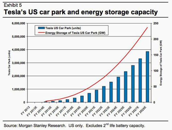 特斯拉对于传统电力公司会造成何种威胁,有很多种看法。摩根斯丹利去年曾预估:到2028年,美国特斯拉汽车总储能量达到2370亿瓦特,相当于美国总储能的22%,10倍于美国现存电力储量。