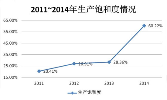 第二,假设我们引入生产饱和度的概念,即产量占产能的百分比(如下图所示),会发现生产饱和度逐年上升。尤其是在2014年,生产饱和度从28%一跃超过了60%,大大降低了设备闲置带来的成本,使得锂电价格降低。