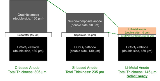 去年,SolidEnergy表示已经研制出一块2Ah的聚合物原型电池,它的能量密度甚至超过了1200瓦时/升,随后其负责人称该试验电池的能量密度最高可达1337瓦时/升。此外,SolidEnergy开发的固体聚合离子液态电解质(SPIL)使得超薄的锂金属阳极得以使用,相比由传统石墨和复合硅作阳极的电池,单位体积的能量密度分别增加了50%和30%。