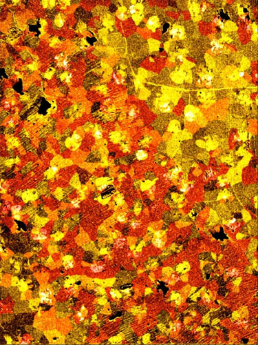 显微镜下的一块石墨烯,伪色标记。每一“色块”代表一片石墨烯“单晶”。图片来源:Cornell.edu
