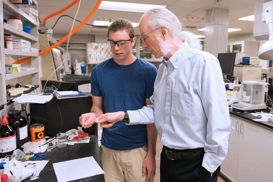 亚利桑那州立大学化学与生物化学系的Dan Buttry教授正与本科生Tylan Watkins测试电池样品