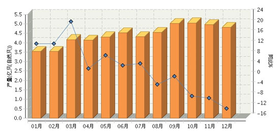 根据国家统计局公布数据,2014年1~12月,全国锂离子电池行业累计完成产量同比减少0.03%。其中:12月份完成产量同比增长-12.3%。2014年全国锂离子电池行业月度产量及同比如图所示。