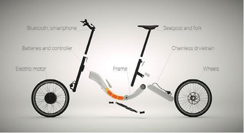最后,这款便携的折叠电动自行车重量仅为15千克,从完全展开到折叠起来只需要四个步骤,折叠好厚可以将车身夹在两个20英寸车轮之间。