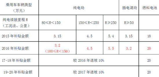 尽管根据2014年12月起草的《国务院办公厅关于加快新能源汽车推广应用的指导意见》等文件要求,财政部、科技部、工业和信息化部、发改委将在2016年至2020年继续实施新能源汽车推广应用补贴政策。但相比于2015年的补贴标准,2016年的补贴标准并未出现下降,反倒有一些小幅度的增长。