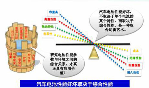 此外,动力电池的各项性能是相互平衡的,或者 说“牵制”的,电池性能的优劣不取决于单个电池的某项特性,而取决于综合性能。从上图中我们可以看出,容量与耐久性、高温性能与低温性能、散热性与绝缘 性、容忍性与成本是四组互相“矛盾”的参数。因此,匡德志强调,只有综合考虑电池性能参数与环境之间的关系,才能真正具有应用价值。