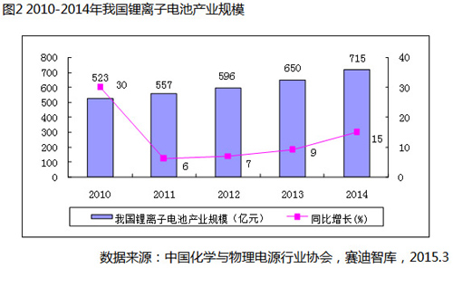 2014年我国锂离子电池产业规模达到715亿元,同比增长15%,增幅比2013年提高6个百分点,增速进一步回暖。受消费电子产品增速趋缓以及电动汽车迅猛发展影响,我国锂离子电池产业发展呈现出“一快一慢”新常态,即动力型锂离子电池需求快速增长,消费型锂离子电池市场增速明显放缓。2014年我国锂离子电池产业发展呈现以下特征:一是国家高度关注,电动汽车迎来春天;二是政府职能转变,发展环境不断优化;三是布局速度加快,锂离子电池企业忙转型;四是资本市场活跃,产业整合势头凸显。
