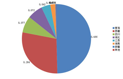 我国是锂资源较丰富的国家。根据中国地质科学院矿产资源研究所的资料表明,目前我国拥有714万吨锂资源量,储量383万吨,主要分布在青海、西藏、新疆、四川、江西、湖南等省区。其中西藏和青海为盐湖卤水型,新疆、四川、江西、湖南等为花岗伟晶岩或花岗岩矿物型。
