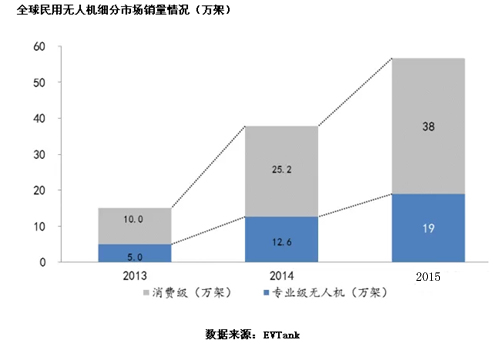 EVTank在研究报告中分析,军用无人机需求与全球各个国家的军费开支息息相关,目前全球军费开支约占全球GDP的3%左右,欧洲经济低迷,美国也打算缩减军费开始,全球GDP增速下滑,预计未来全球军费开支增速也将放缓,所以军用无人机的增长速度不会太快。而民用无人机则将保持较快的增长速度,2014年全球民用无人机销量37.8万架,其中专业级无人机销量约12.6万架,消费级无人机销量约25.5万架,预计2015年同比将保持50%的增长。