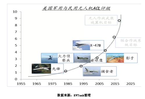 从无人机的定义及发展来看,EVTank认为国外更加注重飞行控制技术,美国空军研究实验室(AFRL)针对无人机自主控制能力,定义了美国未来将发展的无人机自主控制等级(Autonomous Control Level,ACL),共分为十个等级。