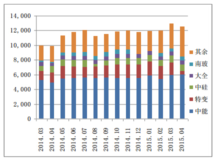图2 2014年4月-2015年4月国内多晶硅分企业产量图 单位:吨 来源:硅业分会