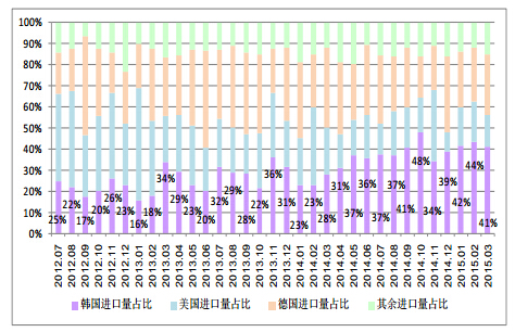 按贸易方式来分,2015年3月份我国一般贸易方式进口多晶硅为3842吨,占比为37.3%,加工贸易等方式进口6454吨,占比为62.7%。分国别具体看来:3月份自韩国按加工贸易方式进口多晶硅2505吨,占自韩国进口总量的59.3%,6/7一季度累计自韩国按加工贸易进口占比为58.2%,韩国依旧连这2.4%的税率都毫无遮拦地规避;3月份自美国按加工贸易方式进口多晶硅1530吨,占自美国进口总量的97.3%,一季度累计自美国按加工贸易进口占比为95.7%,其余从一般贸易渠道进口的为不受“双反”影响的半导体多晶硅;3月份自德国按加工贸易方式进口多晶硅1554吨,占自德国进口总量的52.9%,一季度累计自德国按加工贸易进口占比为46.3%。虽然自韩国按加工贸易方式进口占比相对美国和德国都低,但由于其总进口绝对量大,故自韩国通过加工贸易方式进口量2505吨在总加工贸易量中占比也是最大,达到38.8%,接近四成的加工贸易进口量来自韩国。美国虽然总进口量相比韩国和德国低,但加工贸易进口绝对量在总加工贸易进口量中也仅次于韩国,占比达到24.1%。
