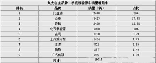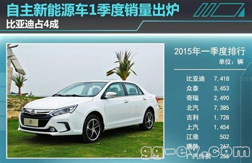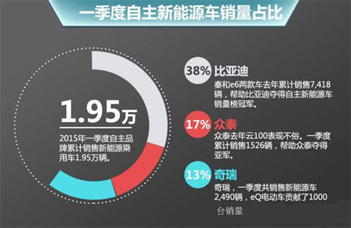 近日,乘联会公布了今年一季度自主品牌的销量,比亚迪独占鳌头,以7,418辆夺得冠军。去年比亚迪全年新能源车销量为1.8万辆,而今年一季度就完成了去年总销量的4成。在新能源销量的前三甲中,众泰以3,453辆位居第二让人侧目。排在第三位的是奇瑞,一季度共销售新能源车2,490辆。紧随其后的是北汽和吉利。北汽E系纯电动车一季度累计销售1950辆,是一季度销量最高的纯电动车。6—9名依次为上汽乘用车、江淮、腾势、广汽传祺。对于下一阶段的发展方面,各大车企均已有规划。