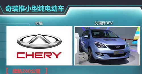 奇瑞去年发布的eQ因为低廉的售价赢得了很多消费者的欢迎。一季度累计销售1,061辆。在今年的上海车展上,奇瑞发布了高一级别的艾瑞泽3EV,该车续航里程大于260km,预计将于2016年年初上市。艾瑞泽3EV基于艾瑞泽3打造,是一款小型车,主要目标用户是年轻消费者,电动版作为艾瑞泽3的衍生车型,无疑是奇瑞拓展新能源市场的又一力作。