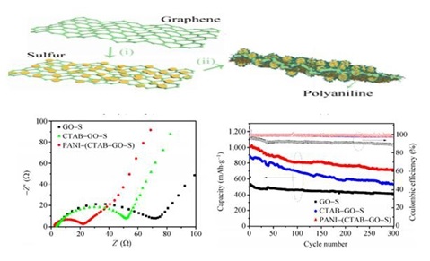 在国家自然科学基金委和中国科学院的大力支持下,中科院苏州纳米技术与纳米仿生研究所研究员张跃钢课题组,围绕纳米硫与石墨烯复合材料的合成及锂硫电池应用领域开展了广泛研究。研究人员利用聚苯胺改进氧化石墨烯纳米硫复合材料,有效减少电极材料的电荷传输电阻,抑制多硫化锂的溶解,提高了复合材料的放电比容量、库伦效率和循环稳定性(Nano Research,2014,7,1355-1363)。
