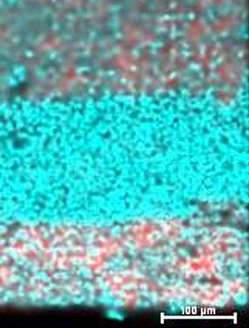 单块电池剖面图。电解质(呈现绿色)构成了整块电池的基础,